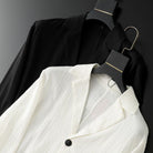 Craft a sophisticated ensemble with a long-sleeved blazer featuring a crisp notched collar, paired effortlessly with loose-fitting pants.