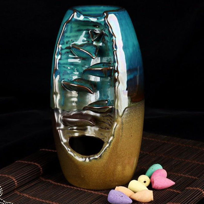 One of the striking features of this burner is the enchanting waterfall effect . When lit, the incense smoke flows downward, creating a stunning visual effect that is both peaceful and relaxing .