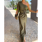 Unleash your style with the Stephanie dress, which combines elegance and style in a sophisticated green colour. This maxi dress has a flattering one-shoulder strap with an open long sleeve made of silky fabric, a flowing cut and a loose bottom to show you off at your best at any event.