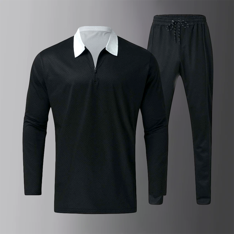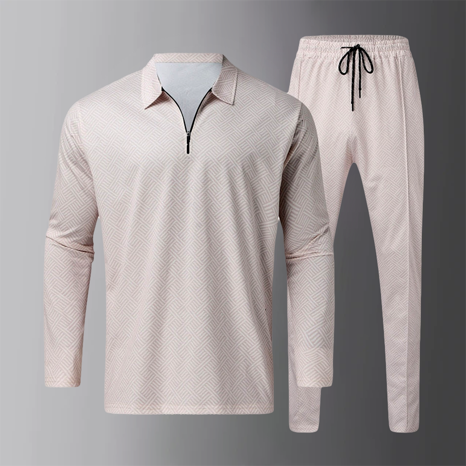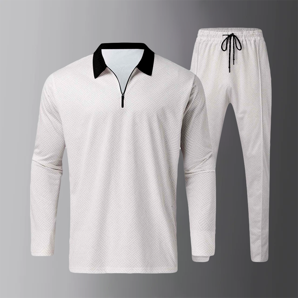 Crafted with a long-sleeved shirt featuring a tonal zipper collar paired with loose-fitting pants, it embodies sophistication. This versatile set is an everyday essential, ideal for both lounging at home and enjoying a sunny day outdoors.