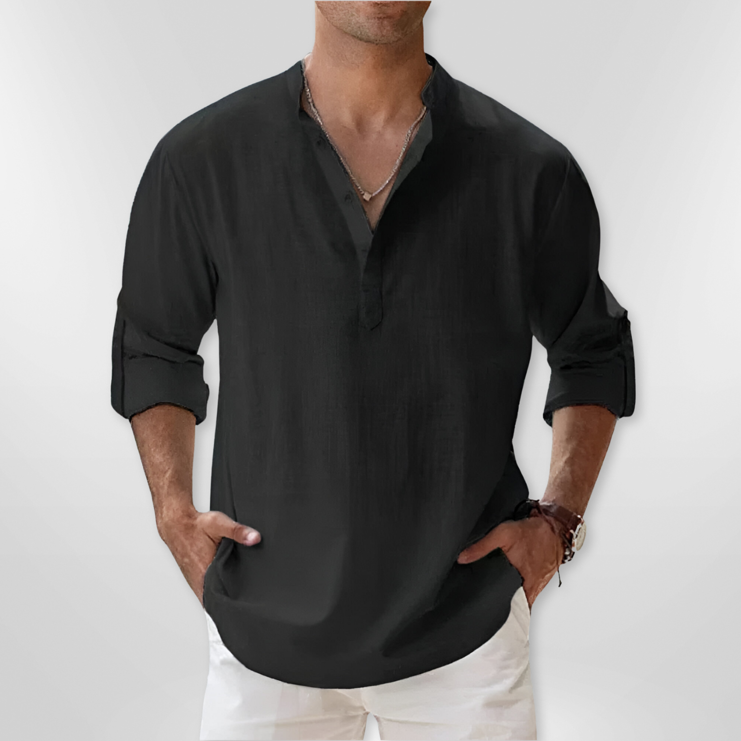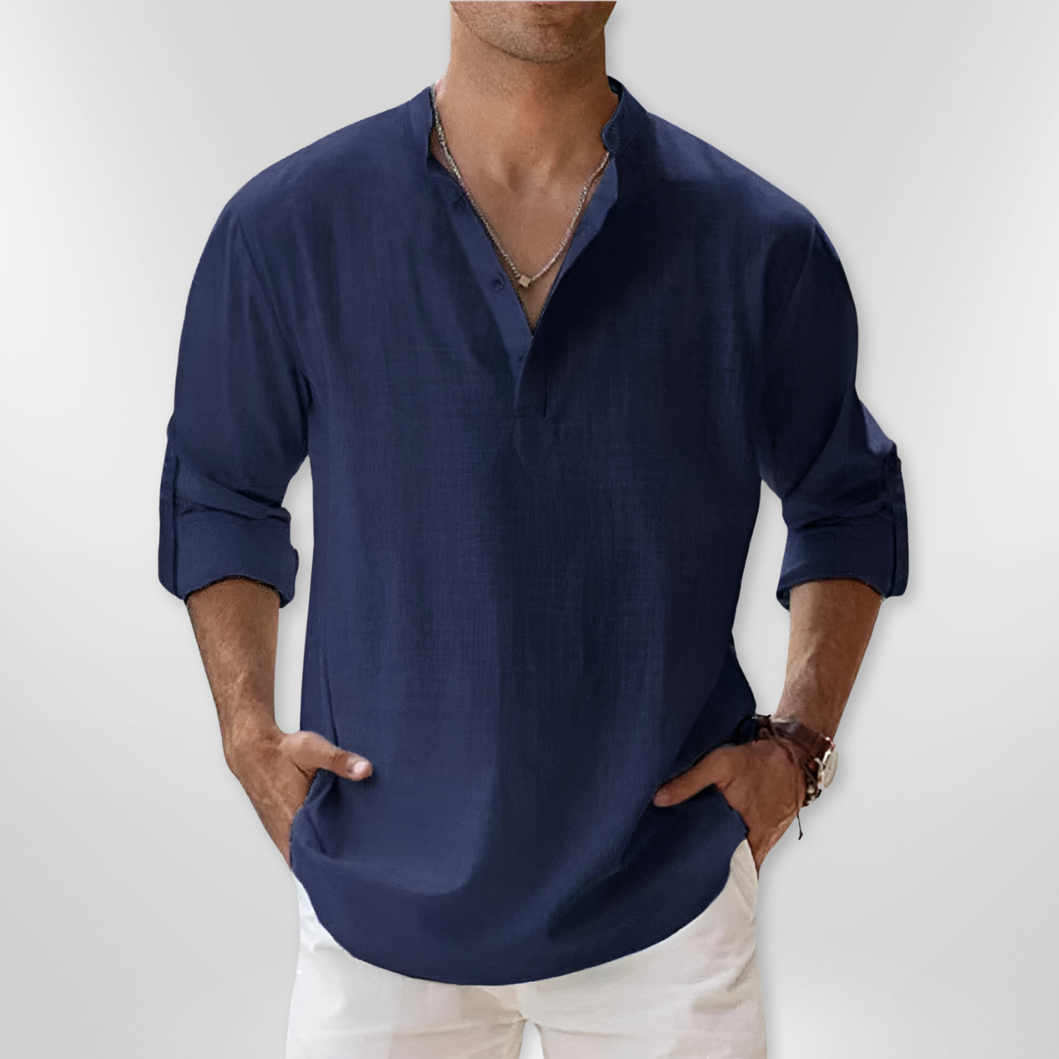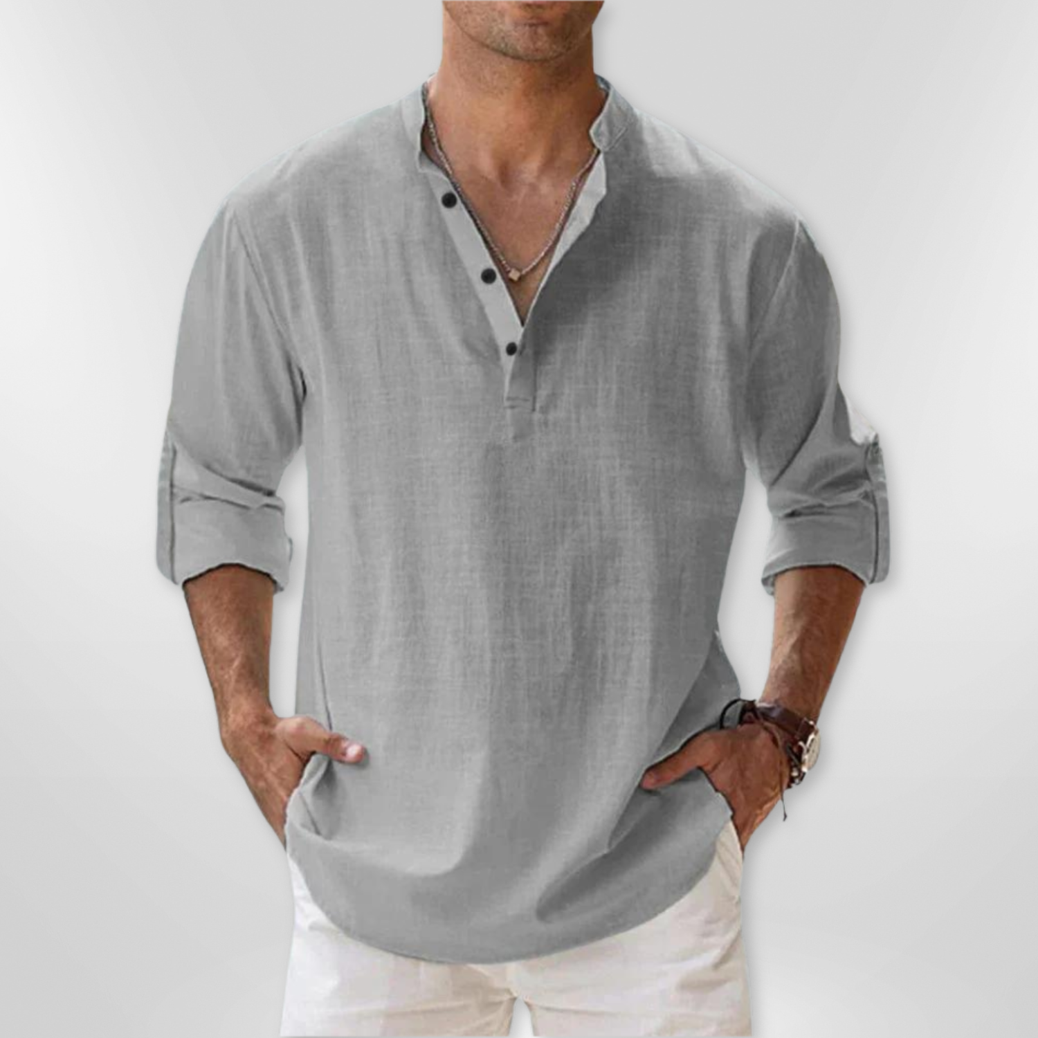 - Fashionable Henley collar for a casual yet refined look.