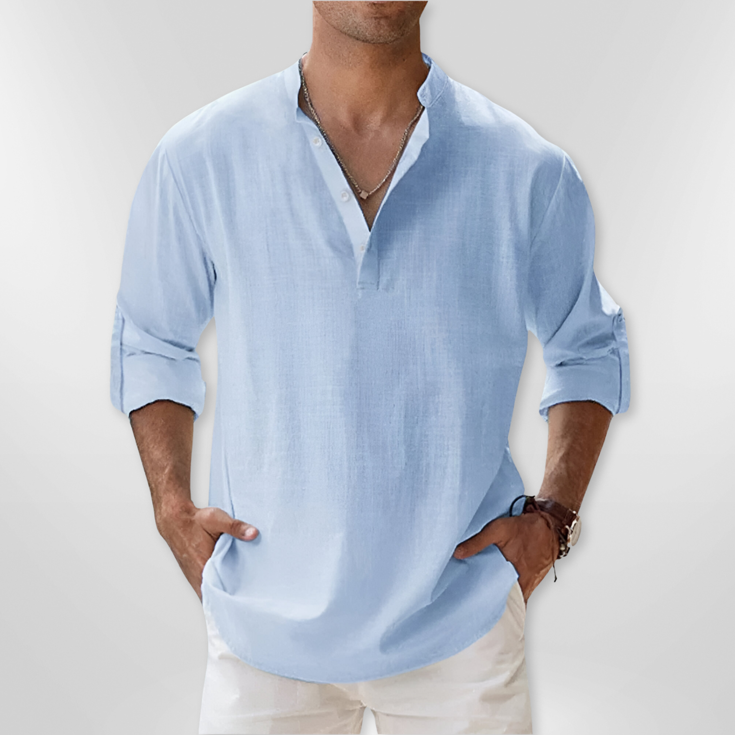 - Long roll-up sleeves for a versatile look.